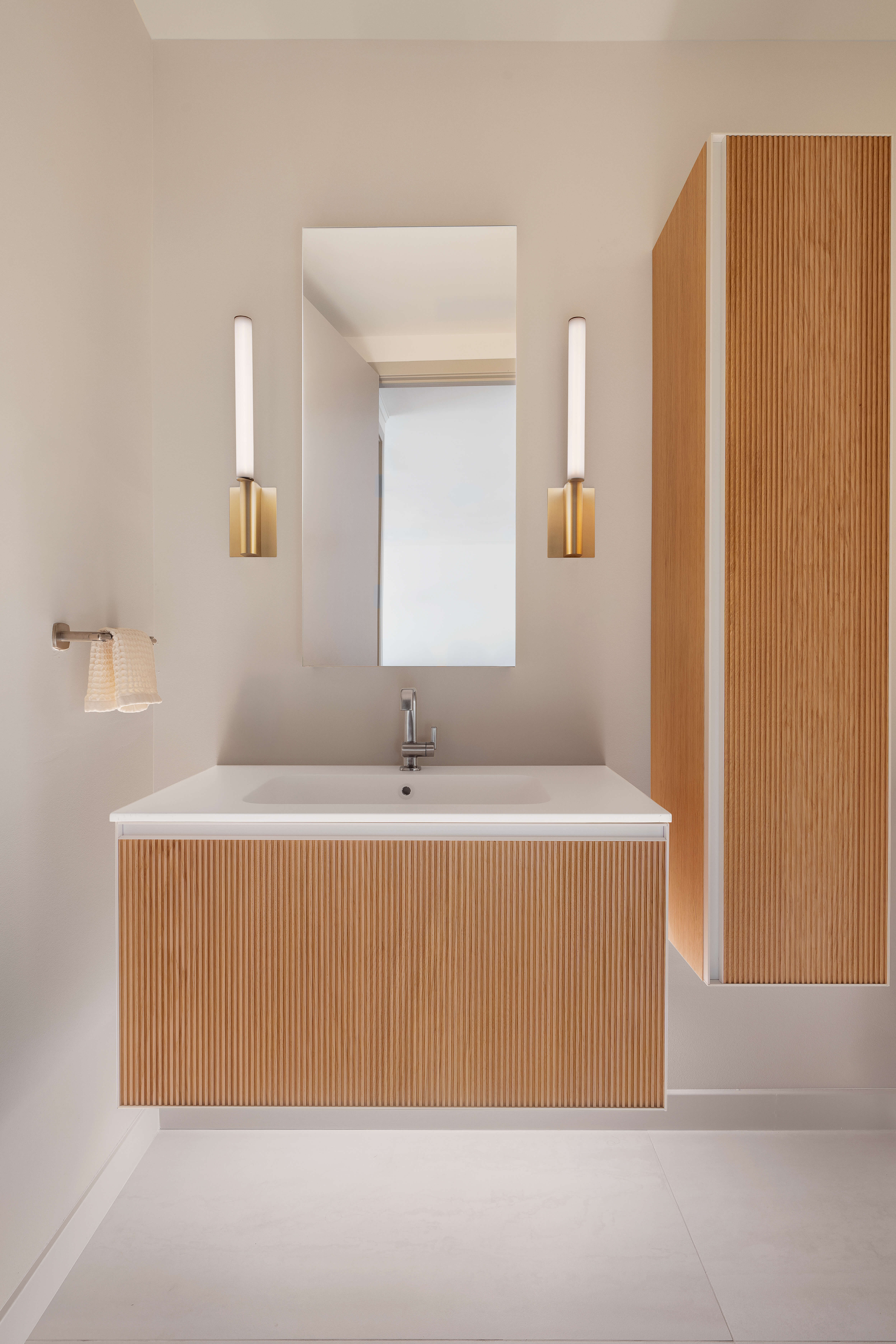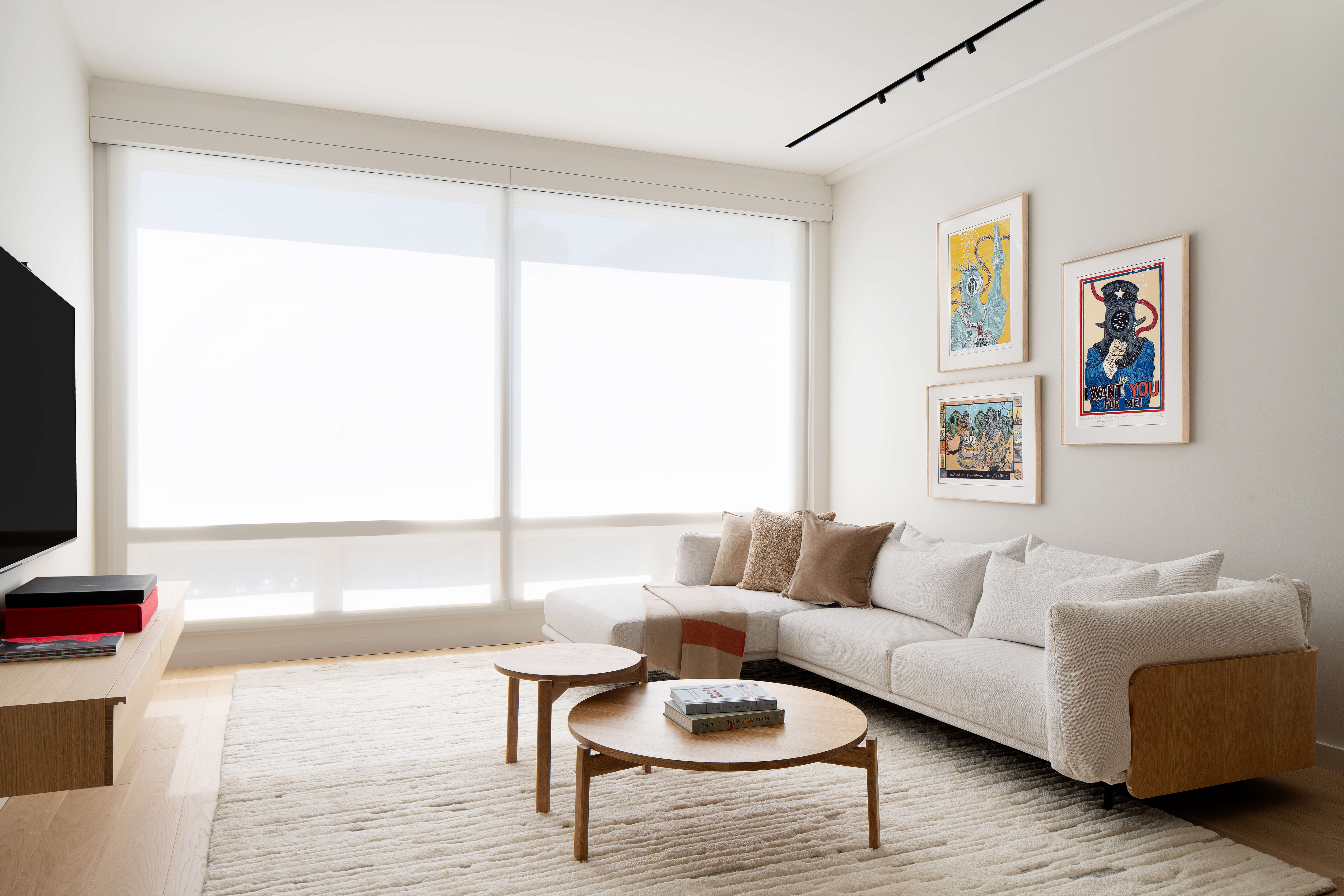 The interiors reflect a Japandi sensibility, blending the quiet minimalism of Japanese design with the soft warmth of Scandinavian style. A palette of neutral tones—beige, taupe, and white—sets the tone for a tranquil interior, while wide-plank European white oak floors lend texture and continuity throughout the space.