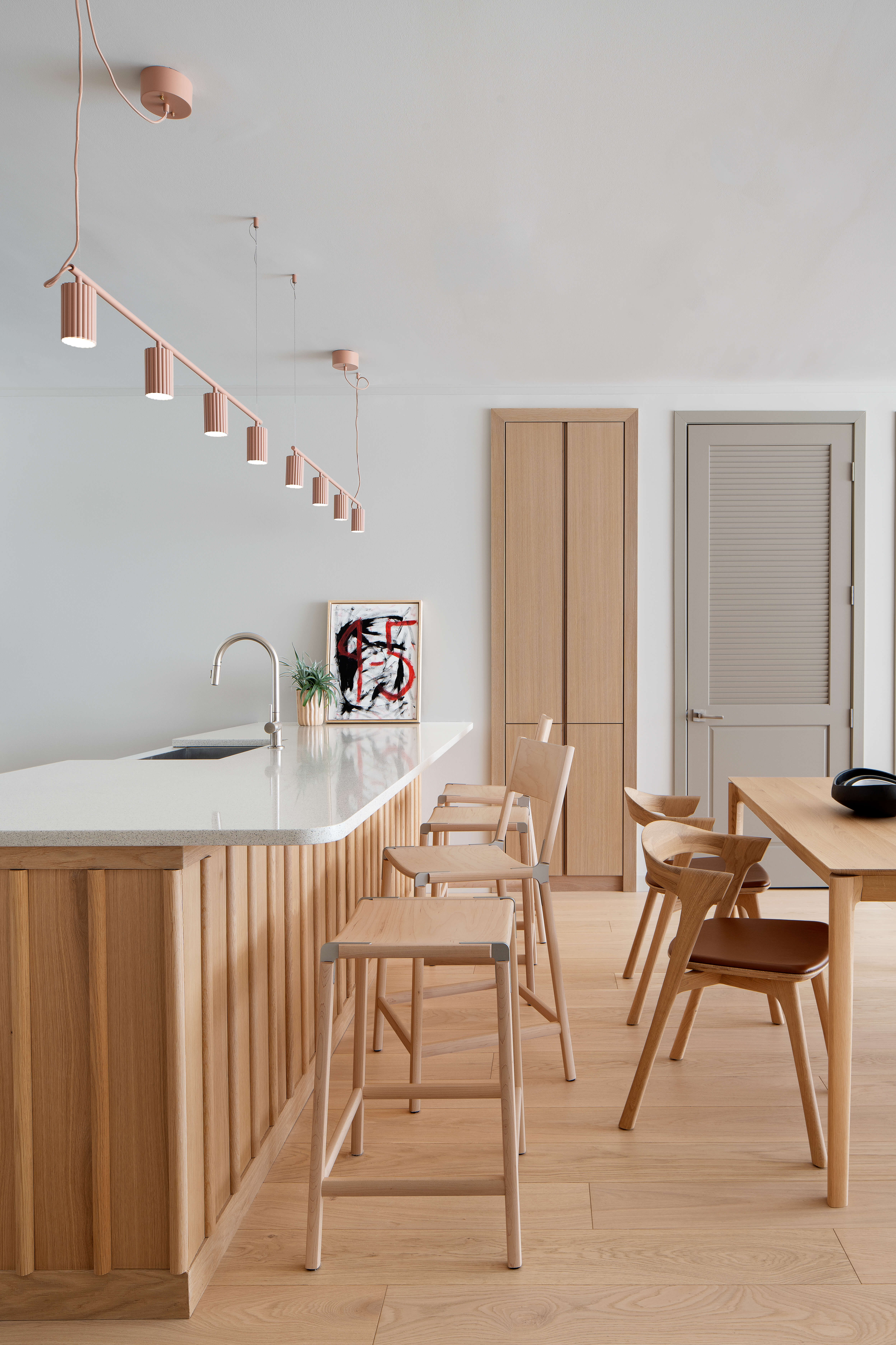 An open-concept plan allows the living, dining, and kitchen areas to flow seamlessly into one another, encouraging connection while preserving intimate moments for rest and reflection. In the kitchen, natural wood cabinetry and hand-grazed porcelain surfaces are accented with Japanese ceramic tile, grounding the space with subtle artistry and tactile depth.